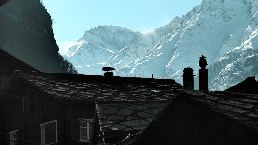 Et un jour je suis allée à Zermatt. J’ai pris ce petit train rouge, à la gare de Visp. Ce petit train qui, tout tranquillement, sillonne la vallée. Il s’y enfonce et monte, monte, monte. Les basses montagnes se transforment en une explosion de falaises, parois rocheuses tailladées, pics épineux dressés contre le ciel. On traverse quelques petits villages aux maisons sombres, nichés au pied des pentes abruptes. Et puis je ne sais pas pourquoi, j’ai levé les yeux – une seconde. Au dessus des toits d’ardoise, mon regard s’est accroché à ce monde que j’apercevais au loin – de la neige si blanche, le ciel clair, en haut de la montagne si fine, un glacier, quelques paquet d’une brume vaporeuse. Là-bas. Un instant de suspension. Si paisible, irradiant de calme, de froid, de silence – une si grande pureté.