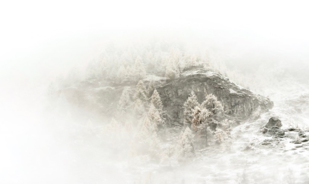 Cette photo a été prise durant le tout premier voyage en train que j’ai fait pour me rendre à Zermatt. De ma vie je n’avais encore jamais vu ni haute montagne ni glaciers. Un après midi de novembre je suis montée dans un de ces petits wagons rouges – il faisait trouble, dehors. Un mélange de froid, de bruine et de brume. Les vitres me semblaient très grandes et très hautes, comparé aux autres trains. On y voyait loin. Plus on avançait plus on s’enfonçait dans les nuages. Les montagnes, les petites fermes perdues, la rivière, tout commençait à disparaître et se dévoilait ensuite au détour d’un lambeau vaporeux. On ne voyait jamais les sommets, perdus dans tout ce blanc. Seulement des morceaux de roche, le pied des sapins. On montait, on montait. Le brouillard était un peu givrant, quelques flocons. C’étaient les premières neiges au pied du Cervin.